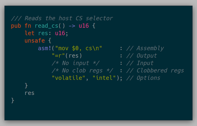 The host state of the kernel involved setting the host registers and segments in the VM to that of the host of the physical machine. Simple wrappers such as the one below were used to gather all of the host information (Note: this code is legacy and doesn't work anymore in current Rust.)