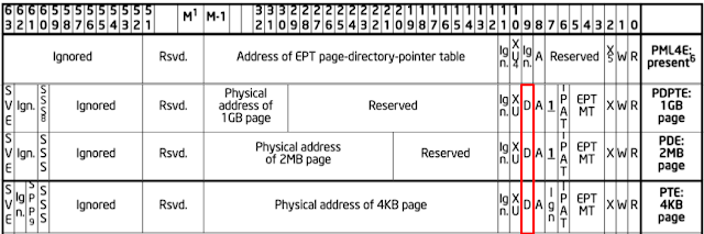 Below is the location of the dirty bit in the EPT entry from the Intel Manual: