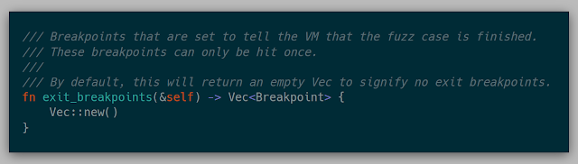 If a fuzzer wants to stop execution and reset if a given location is seen during the execution, it can specify these locations in exit_breakpoints.