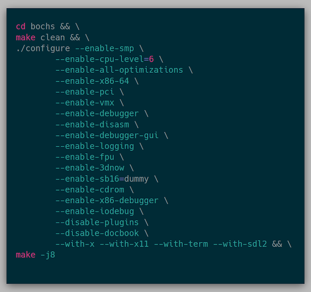 Running the kernel in Bochs was surprisingly easy. To use bochs, I needed to be sure it was built with vmx enabled: