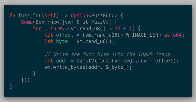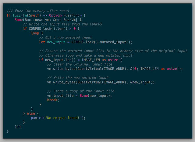 Finally, the fuzz_fn is called at the beginning of each fuzz case. This function is where modifying memory for each fuzz case is implemented. This function could not be implemented and could just be used as a coverage mechanism for tracing or debugging.