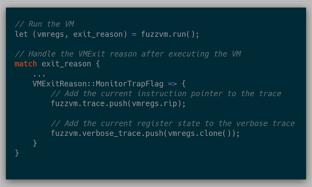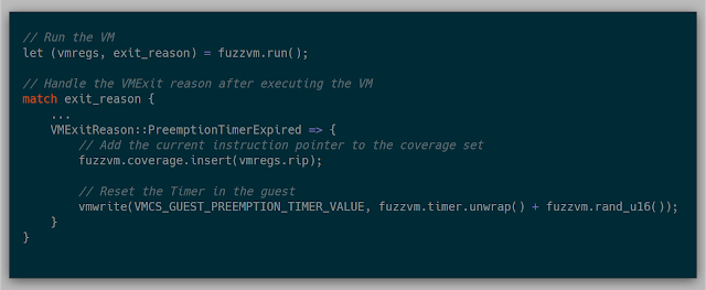 Much like tracing with Monitor Trap, gathering coverage with the preemption timer is fairly simple. By setting a random number in the "VMX-preemption timer-value" field and activating the preemption timer in the VM execution controls in the VMCS, the timer is enabled. Once the timer expires, an VM Exit can be triggered and handled:
