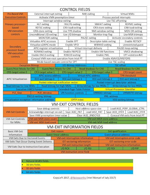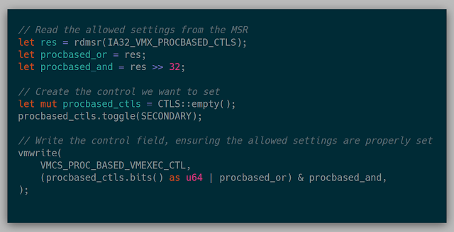 Then came the control fields. There is an MSR that can be read for each of the control fields which is a bitmask of both the allowed 0-settings and allowed 1-settings for that control field. There are specific fields that are only allowed to be 0 or 1. If the opposite occurs, then VM entry fails.