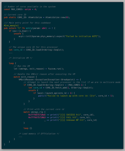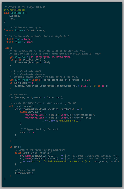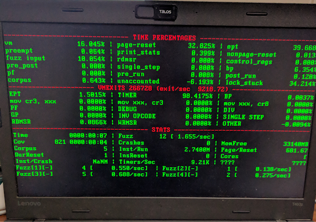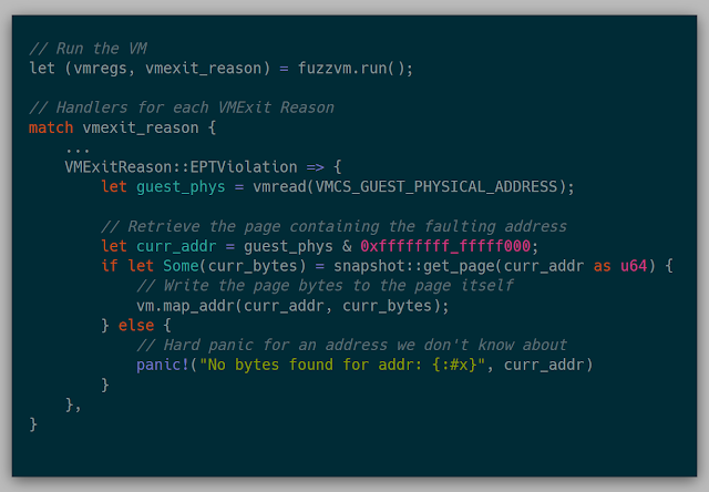 The simple goal of the project was to replay an x86 memory snapshot in a virtual machine (VM) using Intel's virtualization technology Intel VT-x. A snapshot in this case is the collection of system registers and memory at an arbitrary time in execution. Because the main purpose of a VM would be for fuzzing, precise locations of the snapshots are paramount. For example, if there is a file parser in a large GUI driven application, a snapshot could be taken after the GUI has been loaded and after an input buffer has been loaded. With the snapshot in hand researchers can quickly reset to this location, ignoring the precise computing time setting up everything before the parser was called.