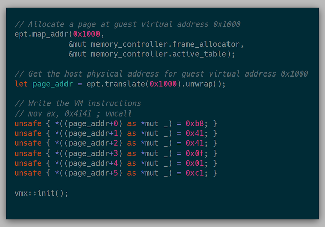 Kernel I knew that I needed a kernel that could boot on bare metal before getting started working on the Intel VT-x portion. At the time, I was also using this project as a gateway to learn Rust. While I didn't write the entire base kernel from scratch, leveraging elements from Philipp Oppermann's similar journey was a great first step into operating system development. I went and read each of his blog posts, cross-referenced the concepts on the OSDev Wiki, and re-implemented the kernel to learn in these early stages.