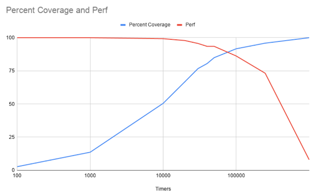 Because each coverage event triggers a VMExit, the performance of each VM can be affected. To roughly calculate this, I needed to measure how long a given execution, without fuzzing, takes without VMExits as well as the total number of unique instructions. From there, I tuned the coverage to generate increasingly more VMExits/second and then ran the execution in a loop for 60 seconds. After execution, because I already had the number of instructions from a full trace, I recorded the percentage of coverage that the current number of VMExits/second found. I repeated this step three times per testing number of VMExits/second to try and get a small sample size average. In this way, this could potentially show what the cost is of gathering coverage for this particular snapshot.