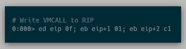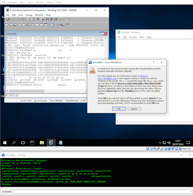 Knowing that vmcall is used to force a guest exit, I was curious what would happen if we used vmcall in VirtualBox. Overwriting the current call instruction with a vmcall and executing it is when I found out about VirtualBox's Guru Meditation: