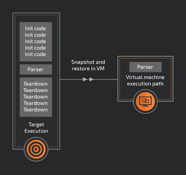 One of the many benefits of a snapshot is that the execution location doesn't need to have a clean internal state to restart. Because each snapshot will start from the same memory and register state, the VM could be stopped at any time. There is no need to find a clean loop in the target, making finding a snapshot location easier.