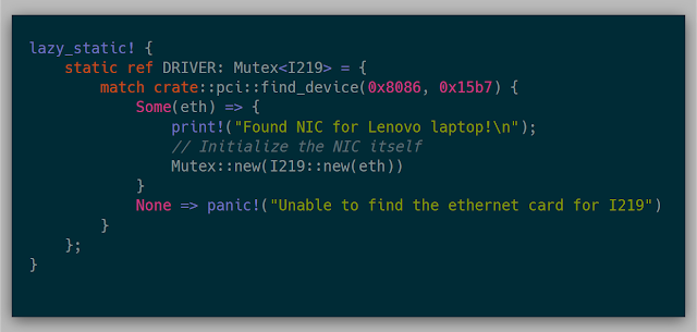 Since the network driver could be used by multiple cores, wrapping the driver in a Mutex allows each core to access the NIC whenever they need. Leveraging the lazy_static crate allows the NIC to be initialized once as a static at runtime. This code will hard panic if the only available NIC wasn't found via PCI. Otherwise, I initialize the NIC and set it in the Mutex.