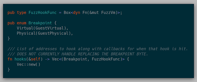 A Fuzzer can also implement a hook for a given address. These hooks are effectively a breakpoint that then calls a closure.