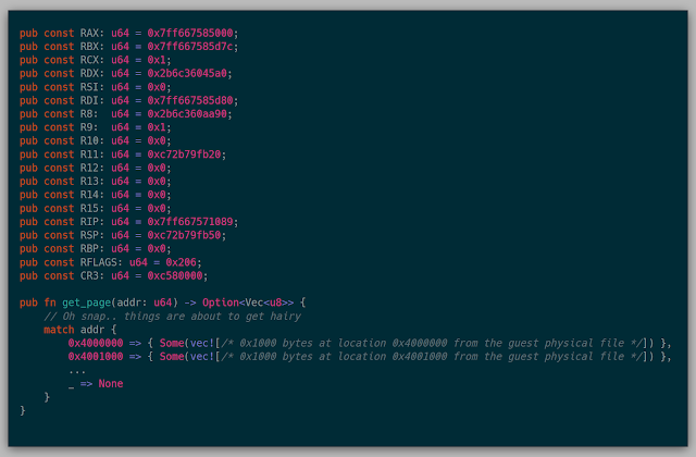 Luckily, this process actually worked. Since this simple application actually used only 10 or so pages in memory, the first run through dumped all the mapped pages to the screen, and I just deleted all the other pages dumped in the snapshot.rs. That way I could actually have a quickish iteration cycle while still practicing on this snapshot.