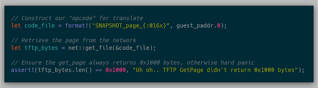 Observant readers may notice the call to snapshot::get_page above. Even with a snapshot in hand, I didn't have a method of getting the bytes into the kernel itself. There was no networking in the kernel for transmitting or receiving data. The kernel was PXE booted, but once the kernel was deployed, no information was getting in or out of the kernel other than through the screen. The solution to this? Compile the snapshot into the kernel. (While this worked, I highly, highly recommend against this.)