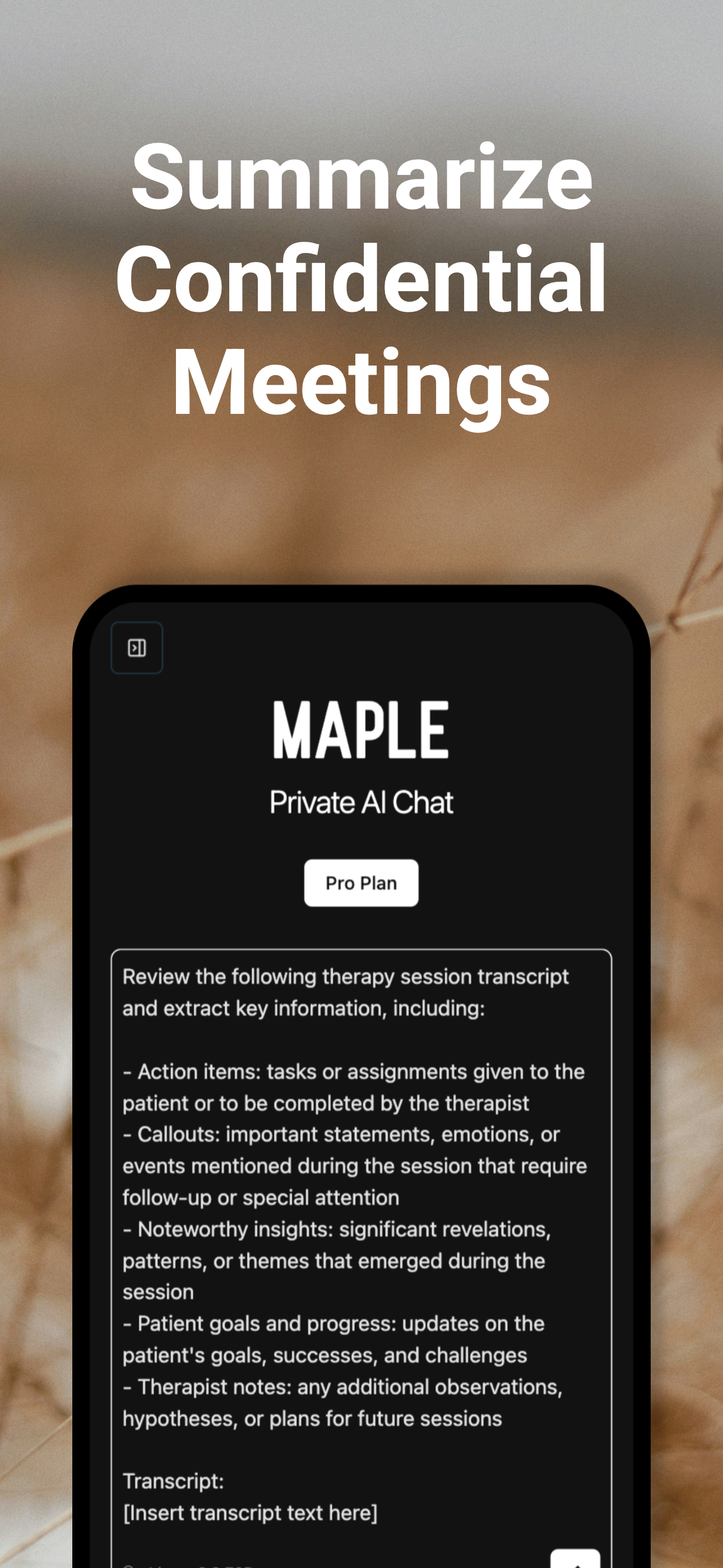 Whether you're a therapist managing sensitive client information, a lawyer drafting confidential documents, or an entrepreneur brainstorming your next big idea, Maple AI delivers secure productivity. Our app helps you:
