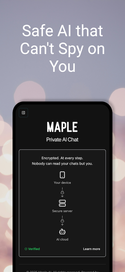 At Maple AI, we believe privacy isn't a feature—it's foundational. Apple's commitment to privacy aligns perfectly with our mission, making your iPhone and iPad ideal companions for Maple AI. With end-to-end encryption, confidential computing, and open-source transparency, your conversations remain exclusively yours—private, secure, and accessible anytime, anywhere.