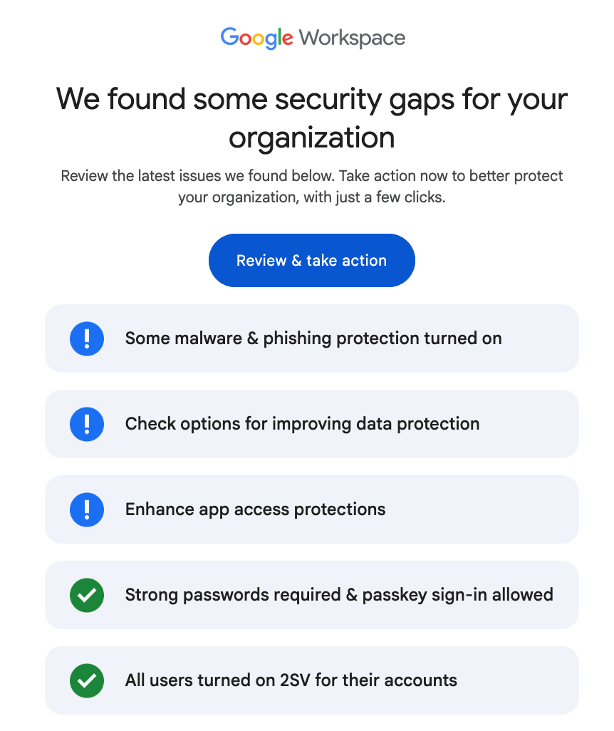 When I clicked on “review and take action” to review the issues Google had said it found, and to “take action to protect my organization with just a few clicks,” I was taken to another page telling me how to “enhance my security in just a few steps.”
