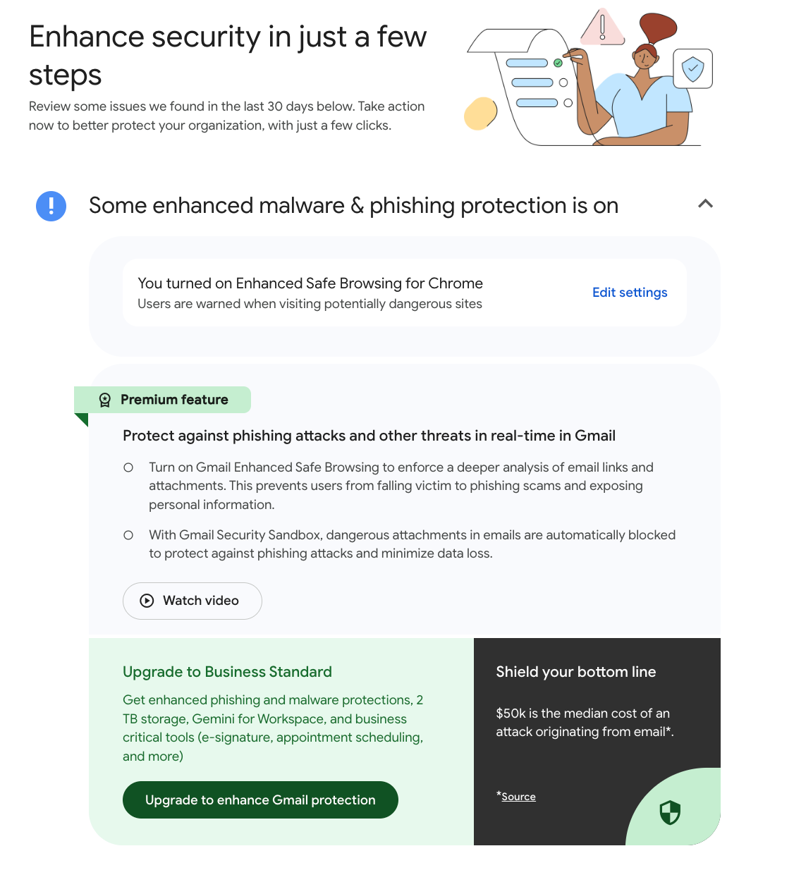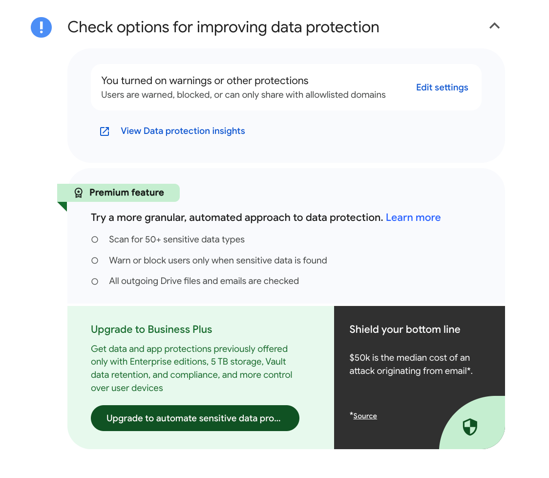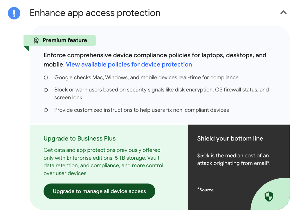 The third and final warning was to “enhance app access protection,” a feature that allows administrators to flag security issues, warn or block users on unsafe devices, and know when users try to access Workspace apps. This was another upsell for the $22/month Google Workspace Business Plus.