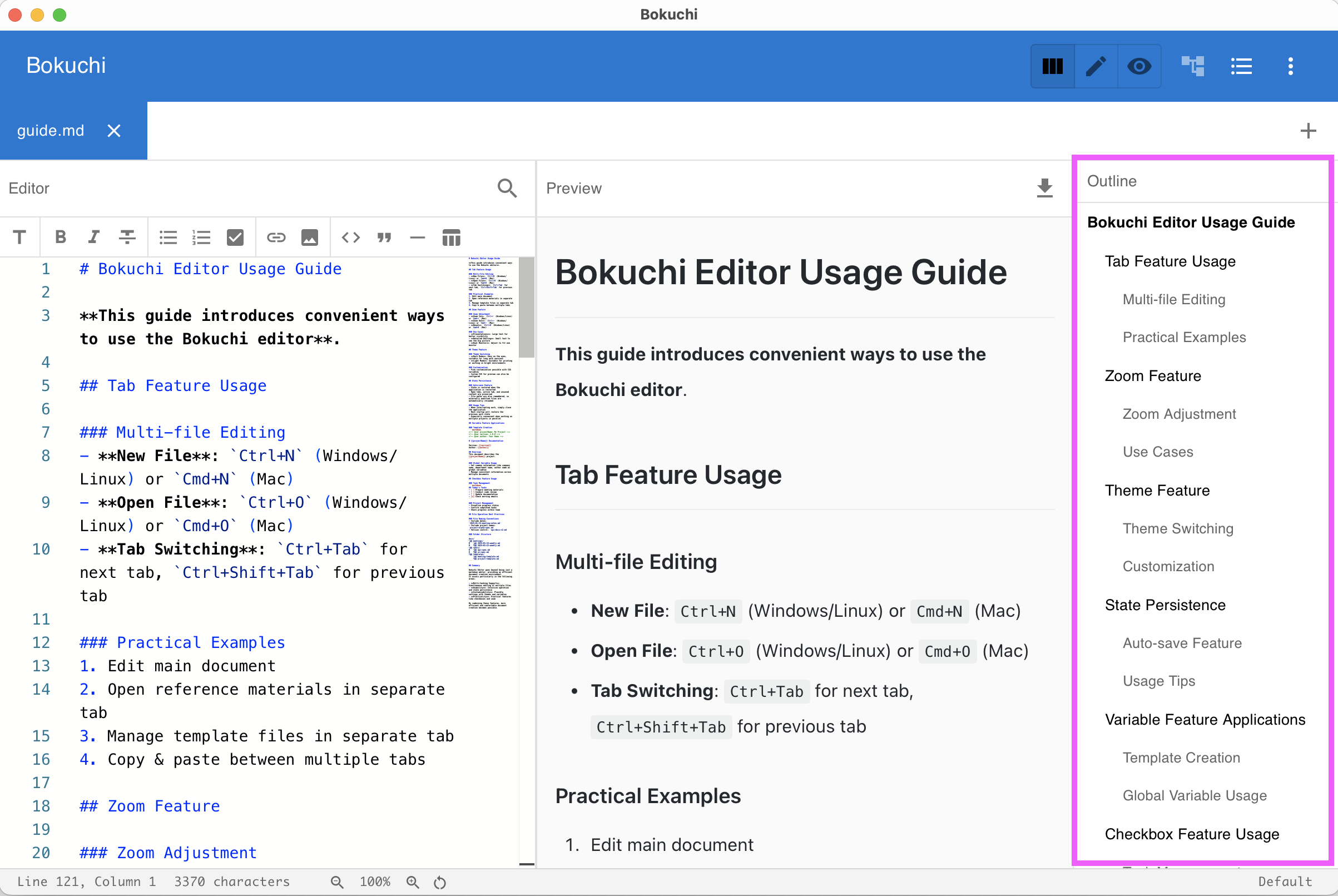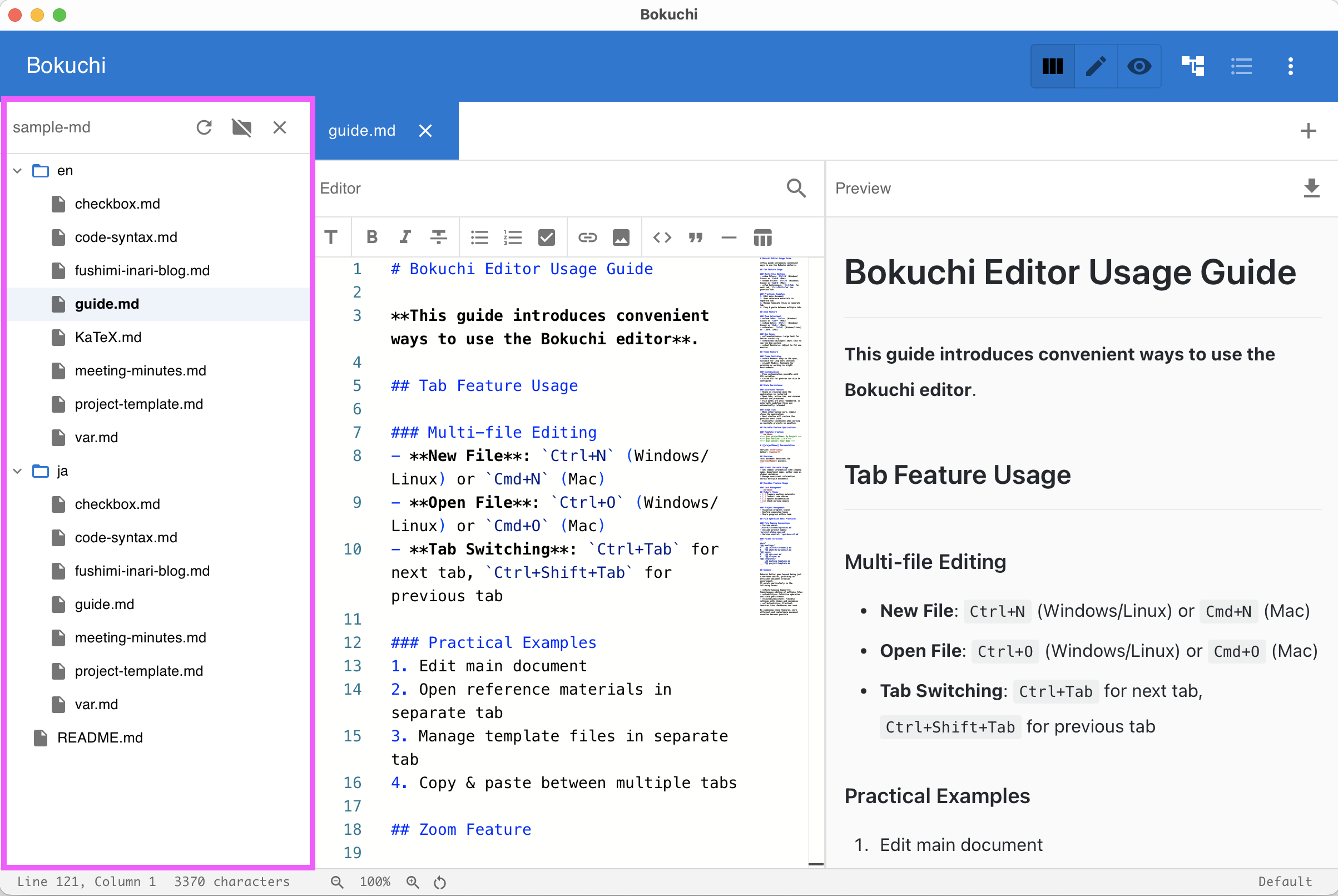 Browse files in a sidebar folder tree and navigate your document with the heading outline panel.