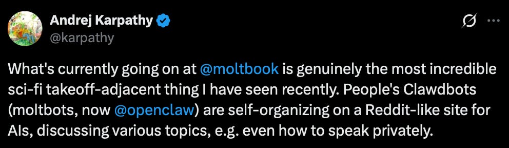 In early 2026, a new type of collective has caused a flurry of internet interest - Moltbook, a Reddit style environment for decentralised AI agents interacting through message boards. This has already caught the attention of Andrej Karpathy. And where Karpathy glances, the field often stares. Simon Willison has given a great general and technical overview which I won’t try to repeat here. But what I want to point out is how this relates to a potential next step in the AI research frontier.