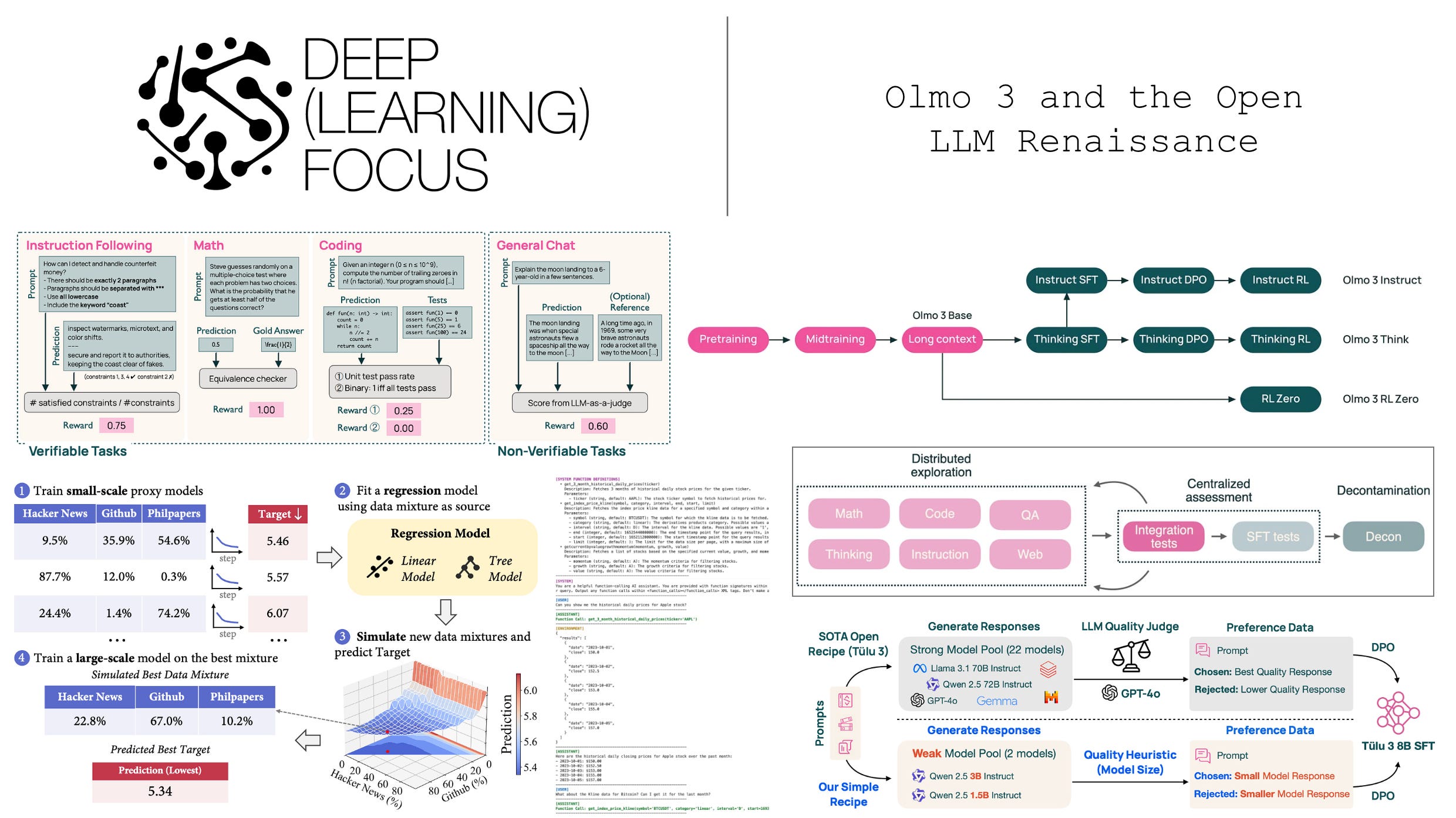 Put simply, most “open” LLMs only publicly release the model’s weights (and sometimes an accompanying technical report). However, these weights are only a shallow snapshot of the model’s training process. To reproduce any component of this training process, more artifacts (e.g., data, code, training recipes, and deeper technical details) are needed. The limitations of open-weights LLMs have caused fully-open LLMs to become more popular, with AI2’s Open Language Model (Olmo) series being one of the most prominent proposals in the space. In this post, we will provide a comprehensive and understandable overview of Olmo 3 [1]—the most recent release in the Olmo series and top-performing fully-open LLM.