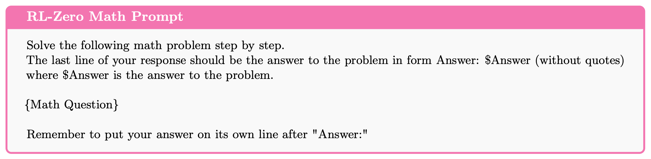 Notable findings. The RL-Zero setup proposed by Olmo 3 is mostly positioned as a cleaner and more reliable starting point for future research. However, authors in [1] also perform some interesting analysis using this setup. First, we see in [1] that using simpler prompt templates—mostly text-based with no special tokens as shown below—is more conducive to performant RLVR. This behavior stems from base models being primarily trained on raw text without special tokens or templates.
