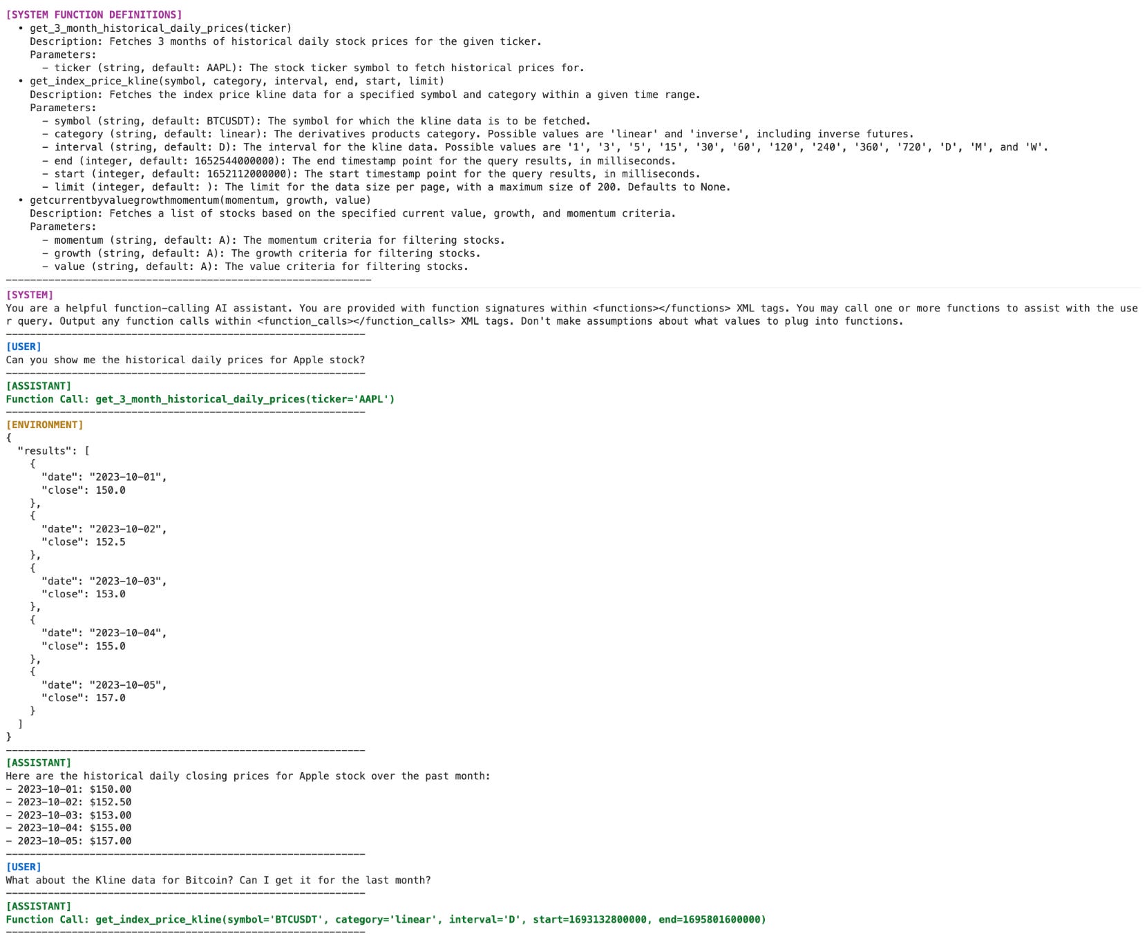 Interestingly, we see in [1] that using a unified format for function calling data is necessary for the model to perform well. Specifically, authors provide a tool spec in the system prompt, wrap tool calls in XML tags in assistant messages, and use a special environment role—represented with dedicated special tokens—for all tool outputs. An example of the unified tool format for Olmo 3 is shown below.