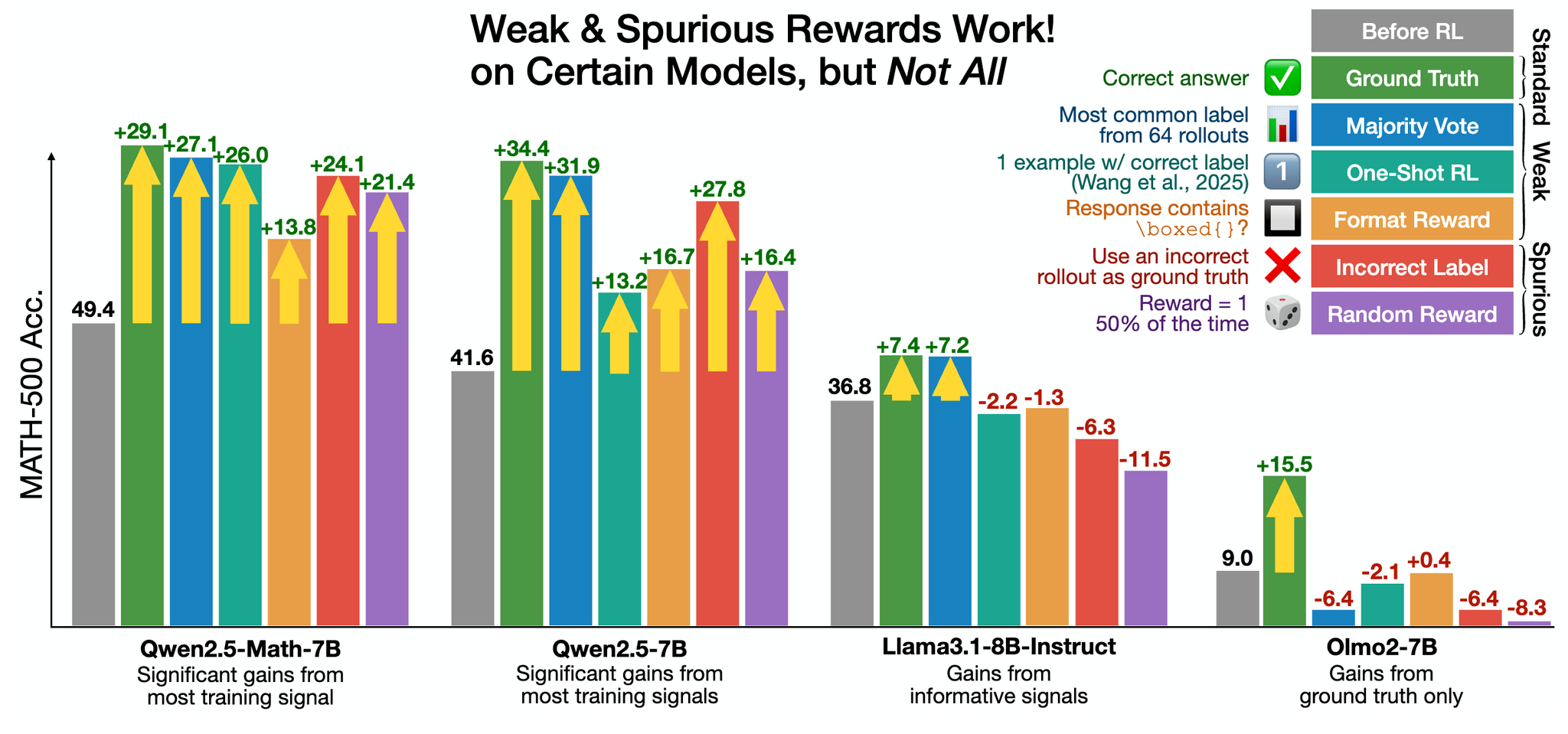 Therefore, there may be some unique aspects of Qwen-2.5—including potential data contamination—that lead to these observations, which are very hard to debug without full openness. For example, beyond data contamination, an alternative rationale exists for the performance benefit of RLVR with random rewards: