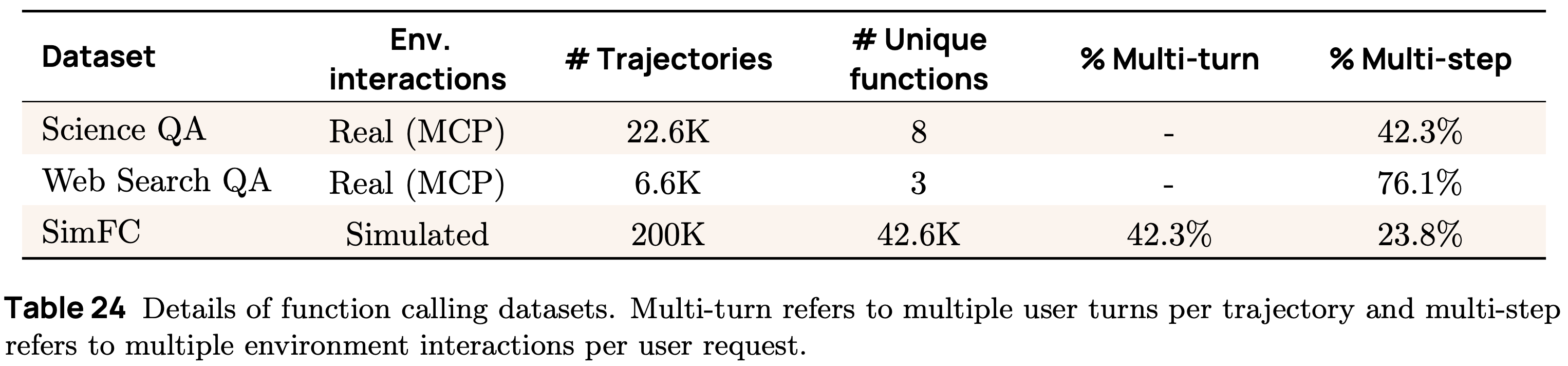Executable function calling environments provide valuable training data by exposing the model to complex interactions with real tool outputs—including errors. Because collecting real tool-use data is hard to scale, however, simulated environments are used to create data for a wider set of function calling scenarios; see below for details. While real trajectories are more complex, simulated data has higher tool diversity and can be used to create examples with both multiple chat turns and multiple agent-environment interaction steps.