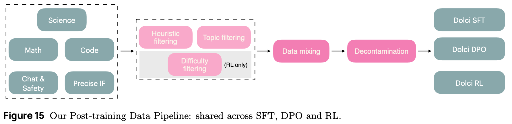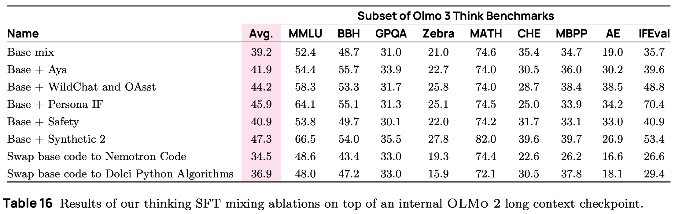As we might recall from the model flow at the beginning of this overview, the Olmo 3 Instruct models are trained starting from Olmo 3 Think SFT, which the authors find to benefit performance of Instruct models.
