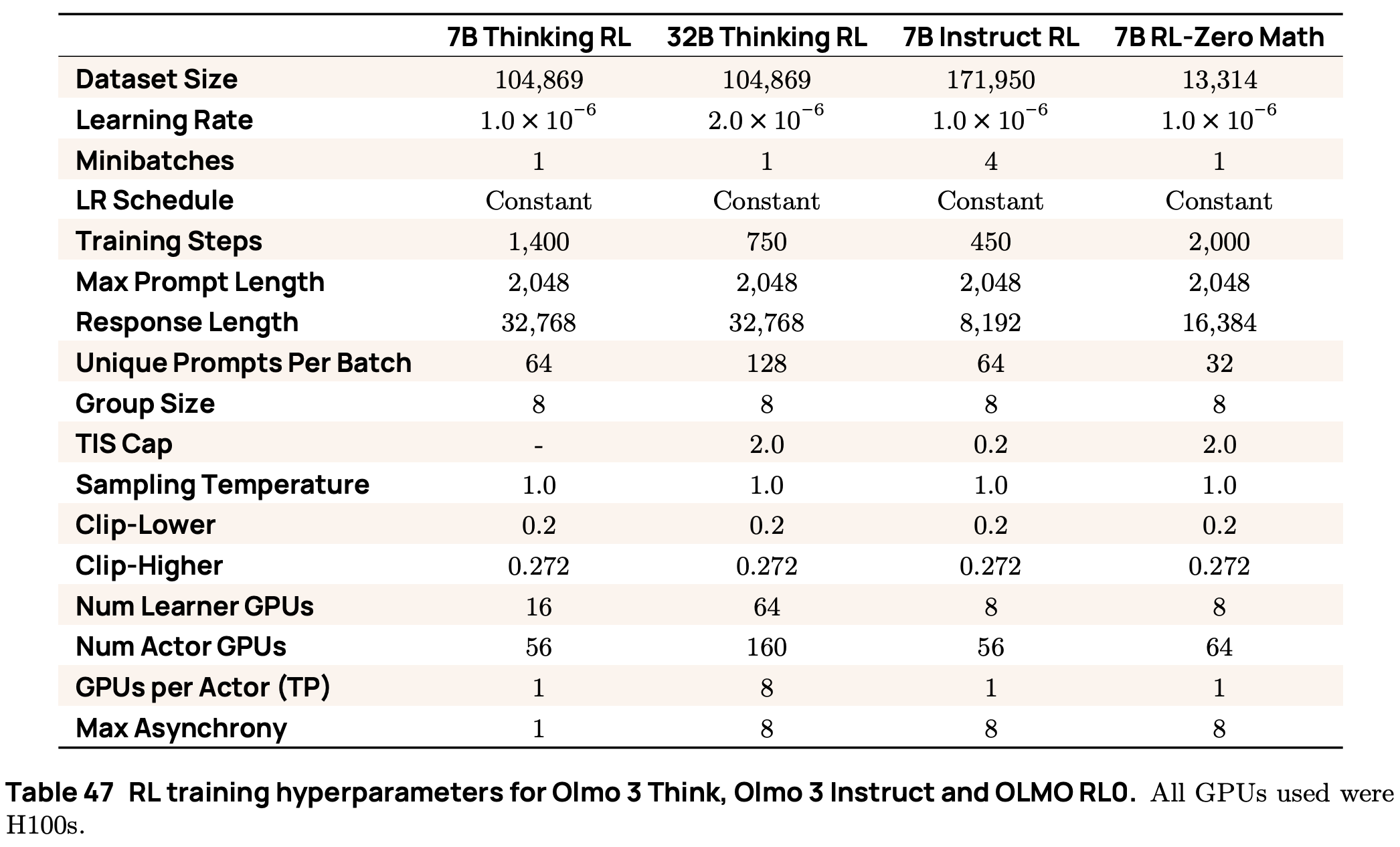 Several low-level threading updates are also made to each of the inference and policy update actors; see here for the full code. When applied in tandem, the set of optimizations proposed for OlmoRL allows the wall-clock RL training time of Olmo 3 RL Think to be decreased from over 15 days to ~6 days!
