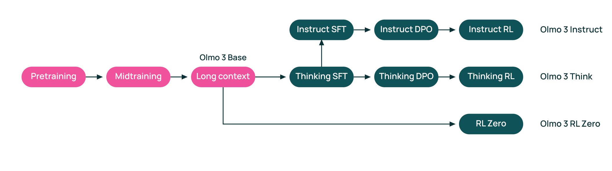 Model flow. The high-level training pipelines, referred to as “model flows” in [1], used for training both sizes (i.e., 7B and 32B) of Olmo 3 models are shown above. Base models for Olmo 3, which are also openly released, are created via a three-stage process of general pretraining, midtraining on targeted data, and a context extension phase. From here, base models undergo a sequential post-training process that includes supervised finetuning (SFT), direct preference optimization (DPO), and RL training to produce multiple Olmo 3 model variants: