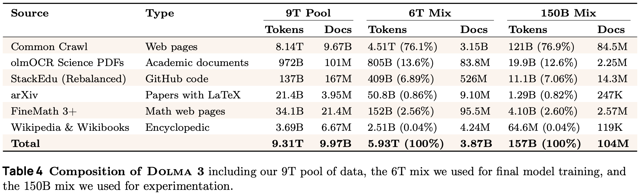 Mixing approach. The full Dolma 3 pool contains 9T tokens, but we must mix and sample this pool—under the constraint of the total number of tokens we want to use for training (i.e., 6T for Olmo 3)—to create the best possible pretraining corpus. As shown in the table above, Dolma 3 is partitioned into groups by type, and we must determine the optimal mixing ratio for each of these groups. The strategy for determining the best data mixture in [1] has two components: