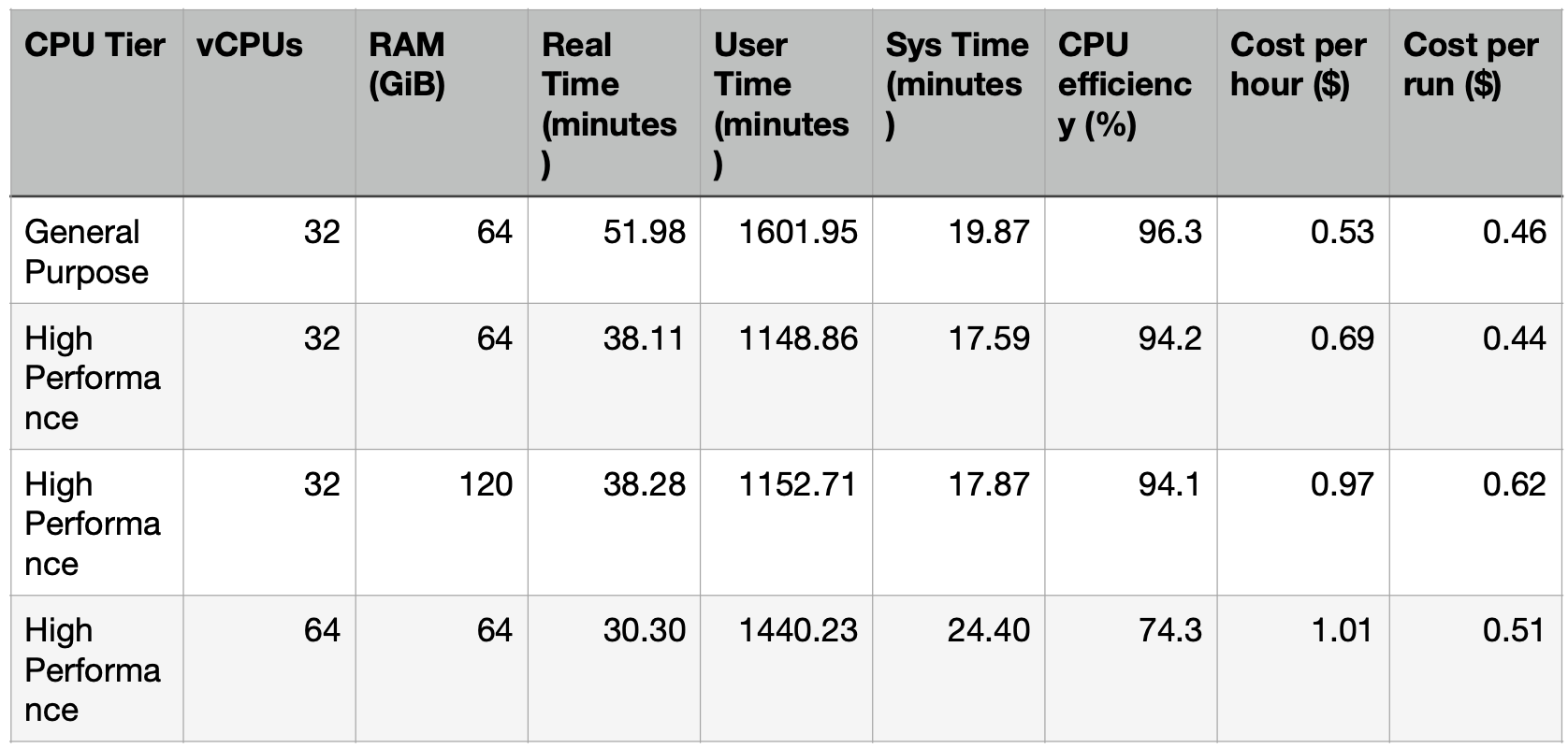 Optimal resource configuration depends on the goal. If you want fast turnaround and don’t care about the cost then adding more vCPUs works by continuing to make the variant calling and fully paralellizable stages faster. If you want engineering optimization then finding the sweet spot of vCPUs and memory that prevents a CPU efficiency drop is the optimal strategy. If you are concerned with cost and have time to spare then finding the resource specs that gives the lowest cost per run without waiting years is the way to go.