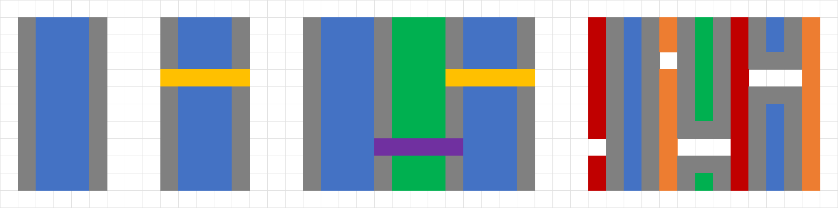 Figure 2. Double SADP approach. Left: First spacers (gray) are formed on sidewall of mandrel pattern (blue). Center left: Etch block/cut (black) is applied to the spacer pattern. This completes the first SADP. Center right: Second spacers (yellow) are formed on the sidewalls of the first spacer pattern, followed by a gap fill (green). Etch block/cut (red) is applied to the gap fill pattern. This completes the second SADP. Right: Wide features are formed with a separate (fourth) mask.