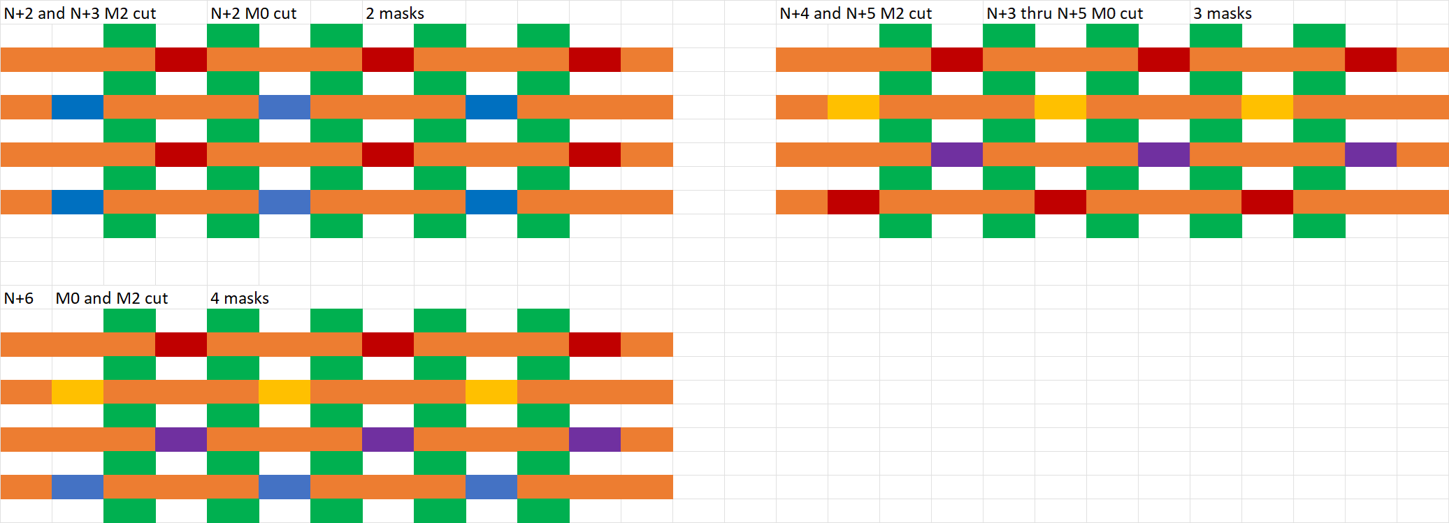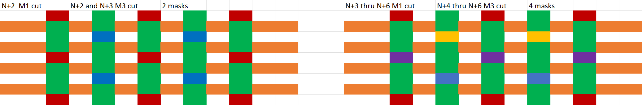 The M1 and M3 layers are likely patterned by SALELE, so that narrow straight line cuts may be used to cut alternate lines, skipping lines in between. This would mean up to four masks (Figure 7).