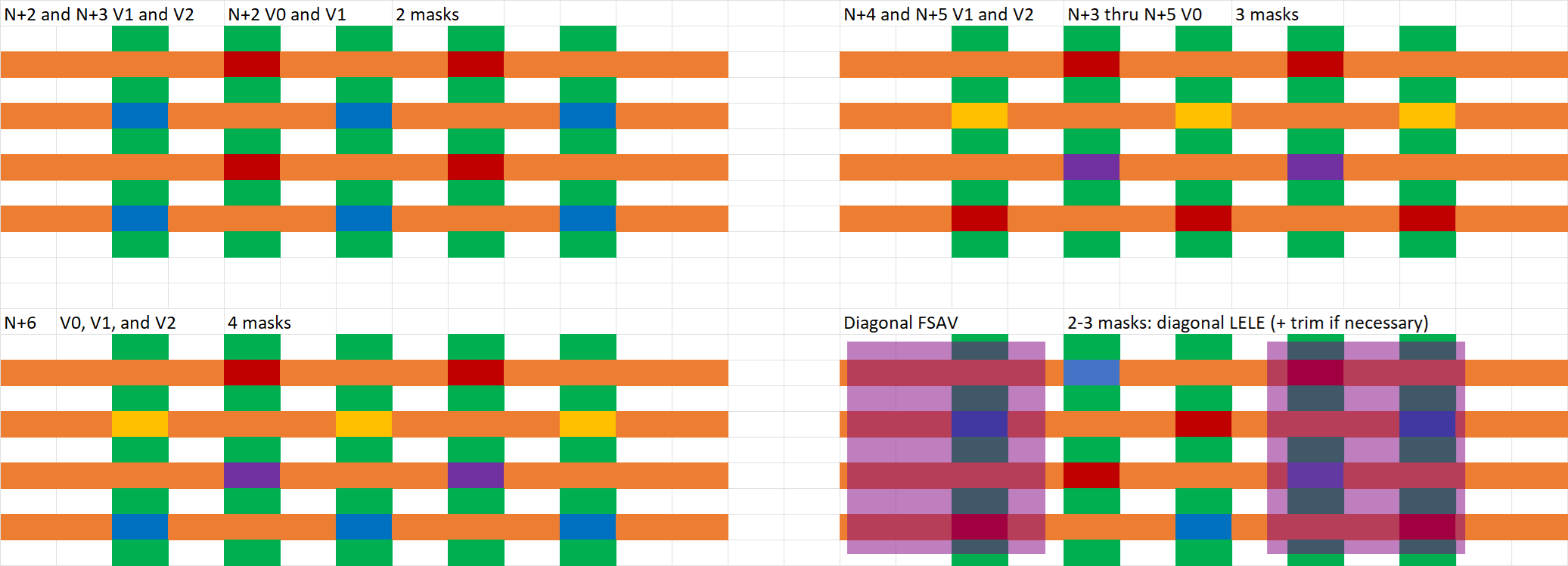 Figure 5. Via multipatterning options. Each color represents a different mask. Top left: double patterning is sufficient for N+2, and some via layers of N+3. Top right: triple patterning would become necessary for N+4 and N+5. Bottom left: for N+6, quadruple patterning would become a necessary allowance if still using brute force multipatterning. Bottom right: Diagonal LELE (plus trim mask if necessary) is most efficient for accommodating the diagonal via grid.
