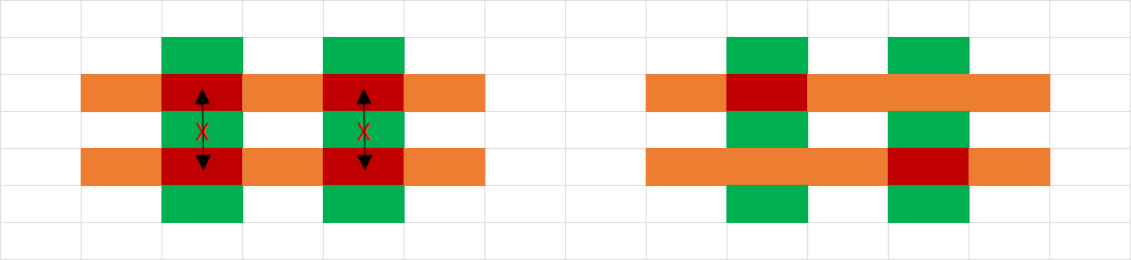 Figure 4. Left: The minimum via pitch cannot be as small as the minimum metal line pitch. Right: Diagonal via locations could be allowed.