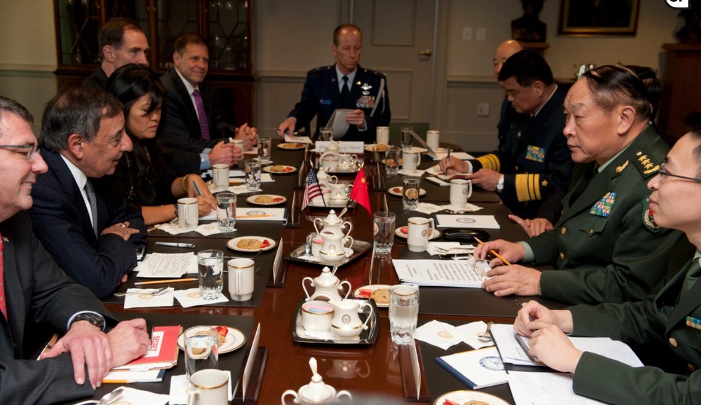 Some legends in this picture – Dave Stilwell, then Defense Attaché in Beijing (who went on to become Assistant Secretary of State after retiring from the Air Force); Peter Lavoy, Principal Deputy Assistant Secretary of Defense; Jim Miller, Undersecretary of Defense for Policy; Secretary Panetta and the late Deputy Secretary of Defense Ash Carter. I can not remember the name of the US-side’s translator in that meeting. General Zhang Youxia is sitting to Defense Minister Liang’s right out of the camera’s view. At General Liang’s left is one of the PLA’s most capable staff officers and English translators, then-Major Xie Kangmin. I was in the back or out in the hall. The sharp eyed observer will note that DepSec Carter brought a folder with a classification coversheet into the meeting. Don’t ask me why.