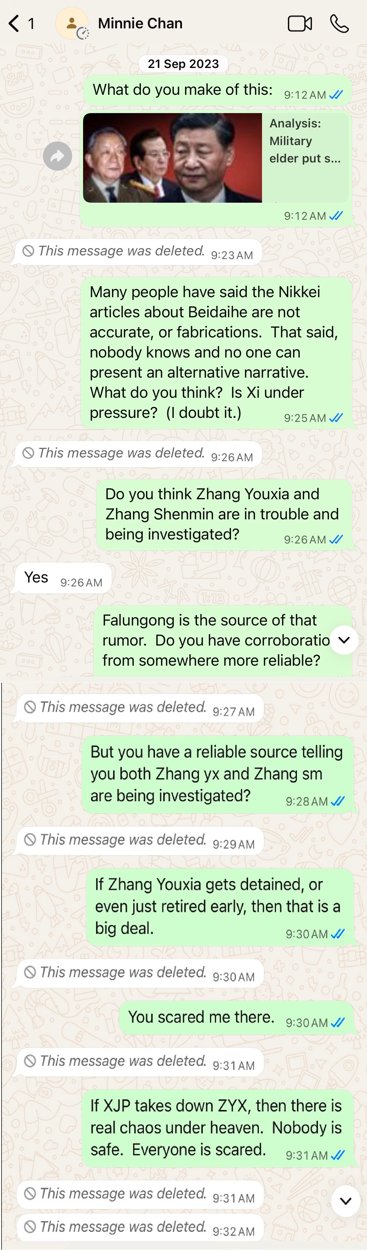 A month before her disappearance we were discussing whether or not Zhang Youxia and Zhang Shengmin were being investigated. She was certain. In September 2023 when I asked, “Do you think Zhang Youxia and Zhang Shengmin are in trouble and being investigated?” She responded succinctly, “Yes”.
