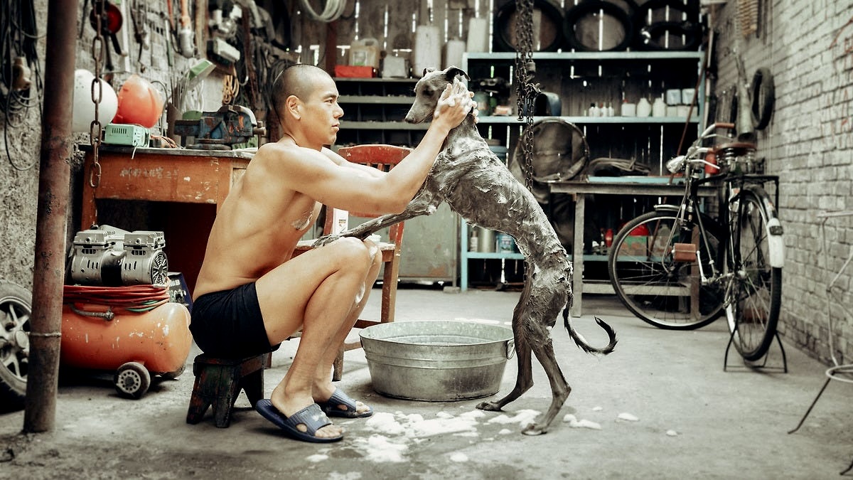It is during Lang’s exploration of the city’s mostly abandoned neighborhoods that he encounters a black stray (a possible mix of greyhound and whippet) that bites anyone who tries to capture him. Lang becomes a bite victim as well but ends up imprisoning the dog in his father’s deserted apartment to make sure neither he nor the canine have rabies during their quarantine. Eventually the two learn to trust each other but their relationship is continually threatened by the town’s dog catchers and Butcher Hu (Xiaoguang Hu). The latter is a snake farm owner and the father of the man who was killed in an accident caused by Lang. Hu is bent on revenge and his cronies relentlessly stalk and harass Lang after his return.