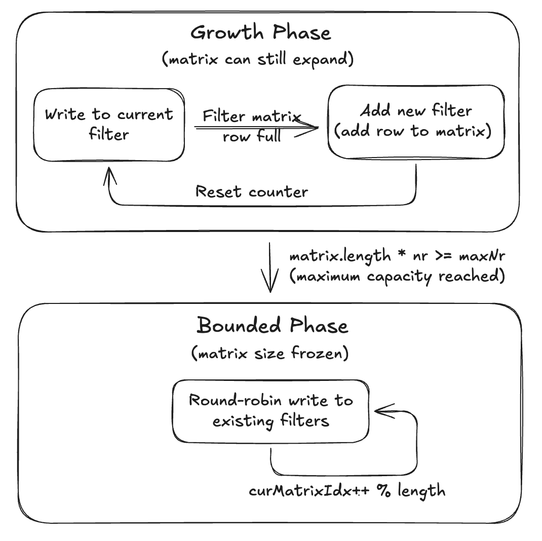Growth phase: When the number of records exceeds the current filter’s capacity, allocate a new filter and chain it. Each filter maintains its original false positive guarantees.