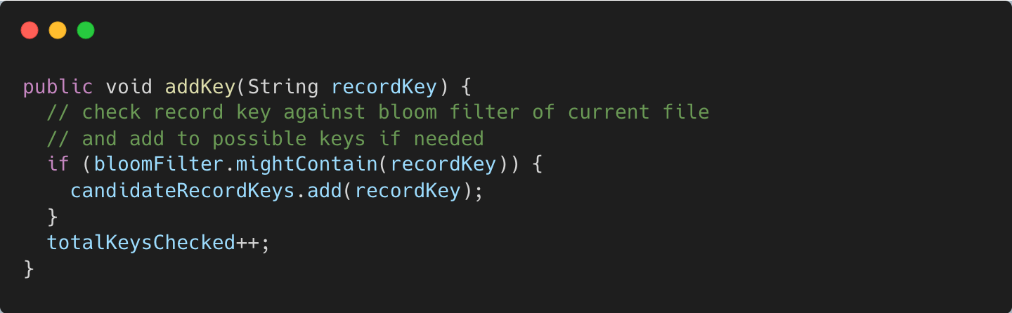 If the Bloom filter says “no,” the file is skipped. If it says “maybe,” the record key is added to the candidate list for verification against actual data.