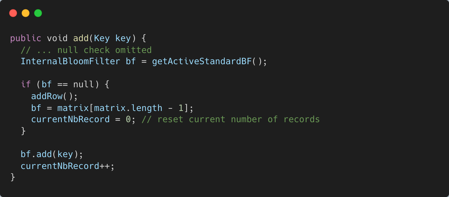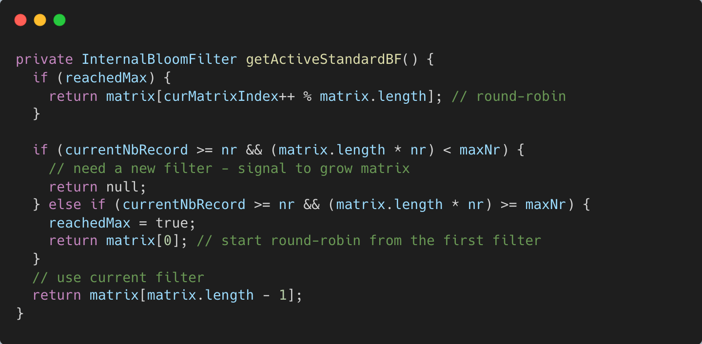reachedMax == true: Maximum capacity reached. Subsequent inserts are distributed across filters viacurMatrixIndex++ % matrix.length.Current filter full, capacity remaining: Returns null to signal the caller to allocate a new filter.