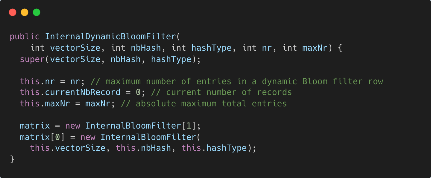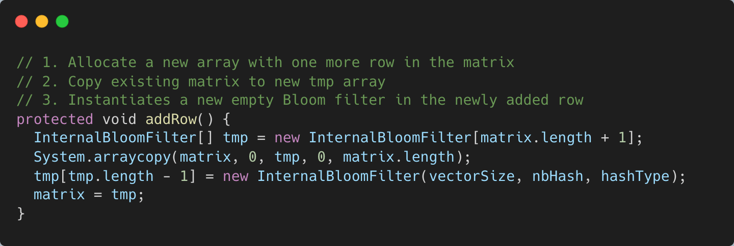 InternalDynamicBloomFilter uses an array called matrix where each element is an InternalBloomFilter containing a bit vector. It starts with one filter. An array is used instead of ArrayList to avoid memory overallocation during expansion.