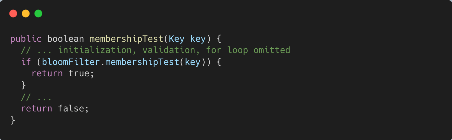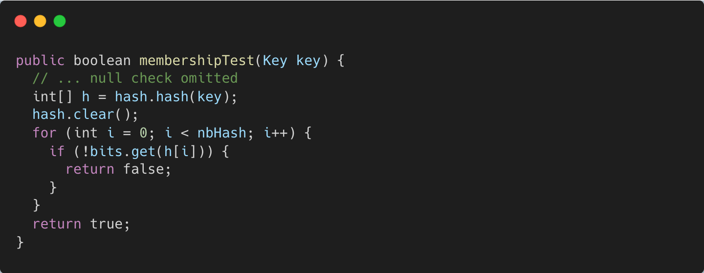 Membership - whether the key is in the set - is tested by checking all nbHash bit positions. If any bit is 0, the key was never added, since add() sets all nbHash bit positions for a key to 1.