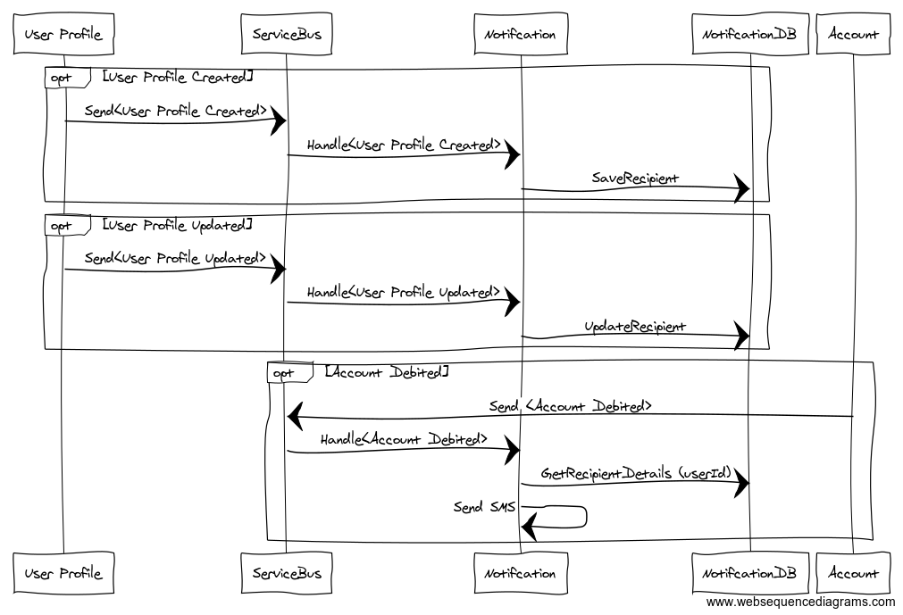 To send the SMS, we have almost all the details in the event body except the account holder name and mobile number of the recipient. In our imaginary system, it is the user profile domain that has those details instead of the accounting domain, that is broadcasting the event. There are two things that can happen here: