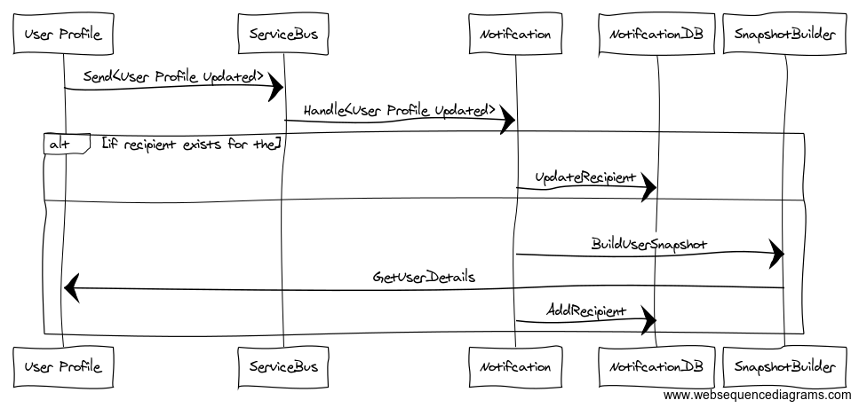 Notification domain can call the User Profile to get more details before sending the SMS. So now we always get the up to date contact details of the user but at the cost of run time dependency. If User Profile system is down for any reason, it would break the notification system as well.