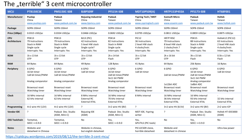 We already learned that there is a large variety of very powerful $1.00 microcontrollers, but what about the $0.10 MCU? Are they indeed all “terrible”, as suggested elsewhere?