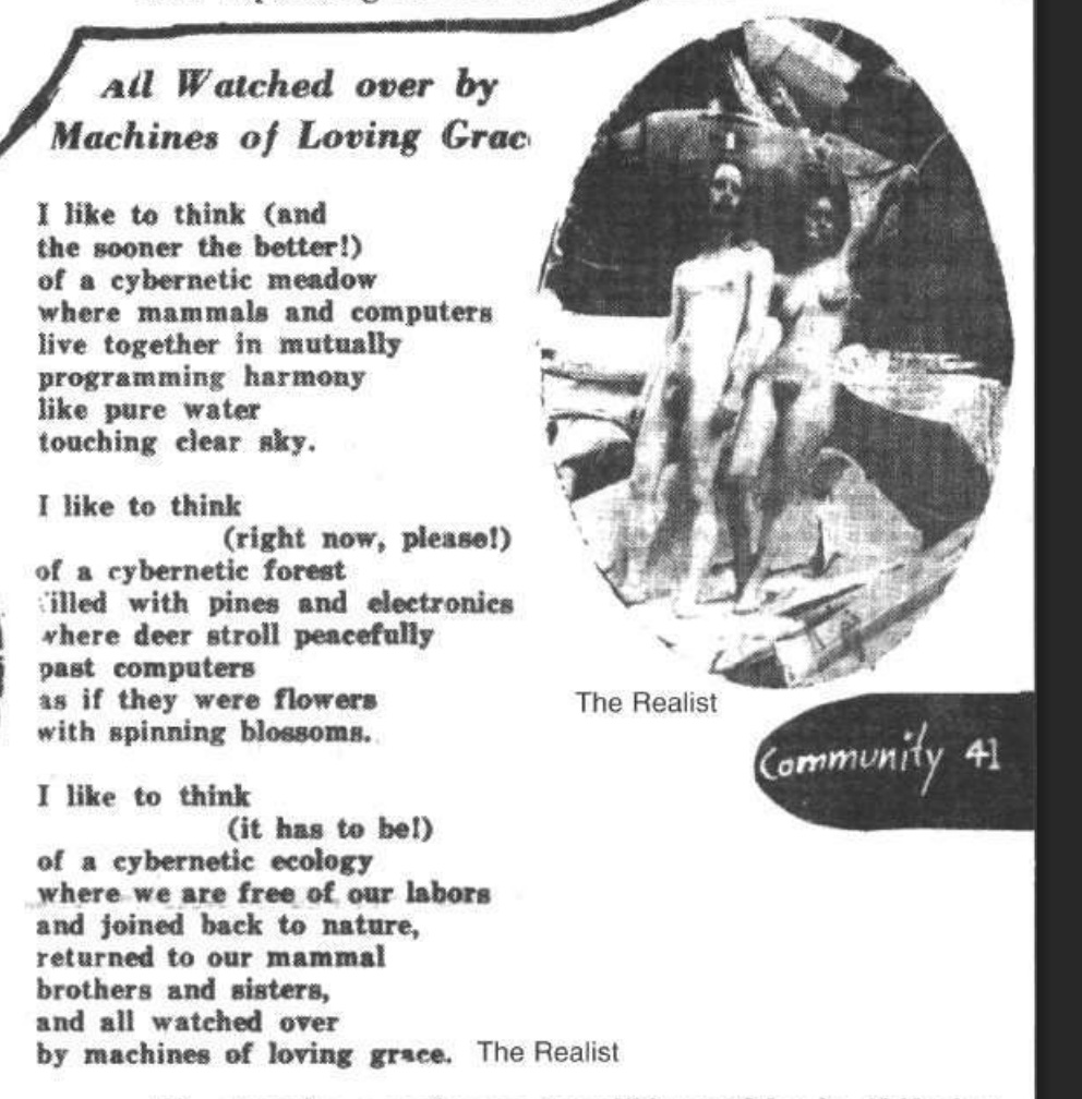 The 1968 edition included a poem by Richard Brautigan titled All Watched Over By Machines Of Loving Grace. The poem imagines a utopia where we return to a primitive state, where mammals live side by side with machines in mutual harmony. Altruistic computers somehow kept The Whole Earth System in check, freeing us from our labours so we can return to roaming through green and pleasant lands.