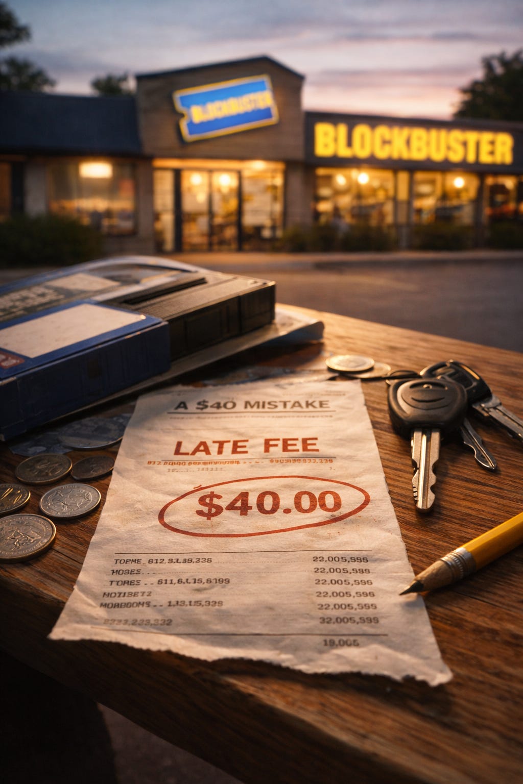 The only problem? You had to return the cassette on time. Hastings forgot. Completely. Days passed, then weeks. When he finally went back to return it, the late fee had piled up to $40 a dollar a day.